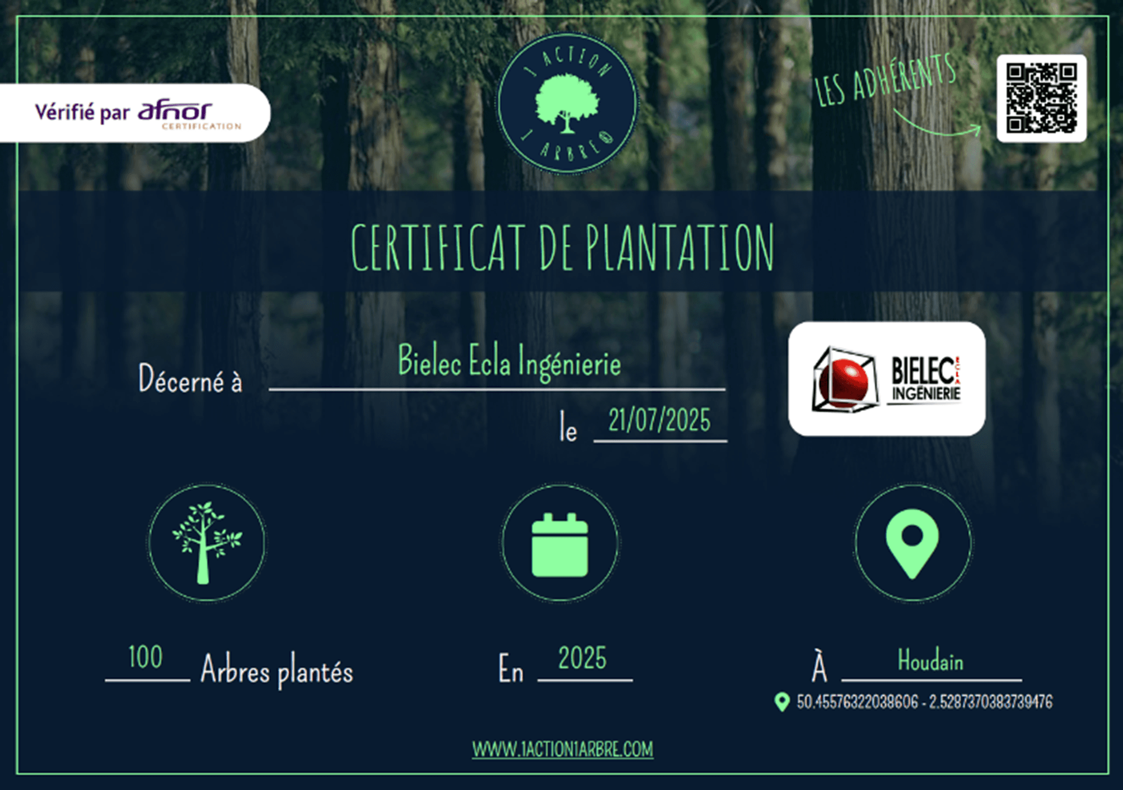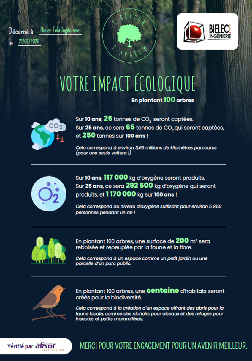 Dans le cadre de notre démarche RSE, BIELEC ECLA est fier d’être adhérent au label 1Action1Arbre juillet depuis 2025.